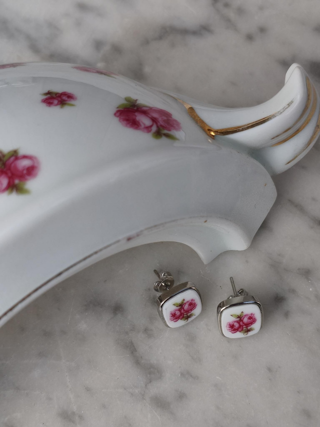 Ces boucles d’oreilles sont façonnées à partir de porcelaine ancienne de la manufacture Pirkenhammer, produite entre 1918 et 1938. Le motif de roses, finement dessiné, contraste avec la sobriété de la porcelaine blanche. Les carrés d’environ 10 mm mettent en valeur le décor sans excès. Une paire élégante, à la fois romantique et discrète.