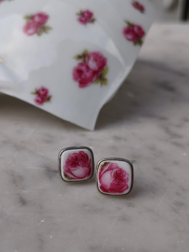 Ces boucles d’oreilles sont réalisées à partir d’un sucrier ancien en porcelaine de la manufacture Pirkenhammer, datant de la période 1918–1938. Le décor de roses apporte une touche florale douce. Les éléments carrés mesurent environ 10 mm et offrent un rendu équilibré et raffiné. Un bijou discret, pensé pour celles qui aiment les détails délicats.