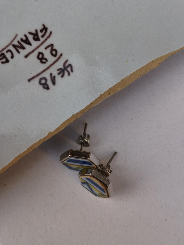 Ces boucles d’oreilles sont réalisées à partir d’une assiette ancienne en faïence de Desvres, attribuée à la manufacture Fourmaintraux. Le motif graphique apporte une touche visuelle affirmée tout en restant équilibrée. Les éléments hexagonaux mesurent environ 10 mm, un format discret et confortable à porter. Leur style sobre, légèrement rétro, s’intègre facilement à une tenue du quotidien.