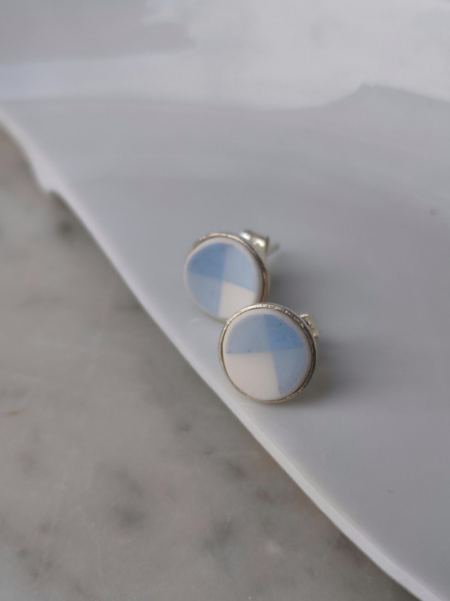 Ces boucles d’oreilles sont réalisées à partir d’un fragment de tasse en porcelaine, dont la manufacture n’a pas pu être identifiée. Le motif vichy bleu clair évoque une esthétique douce et familière, à la fois classique et très fraîche. Les ronds mesurent environ 10 mm et mettent en valeur le décor sans le surcharger. Une paire simple et lumineuse, qui se distingue par la délicatesse de son motif.