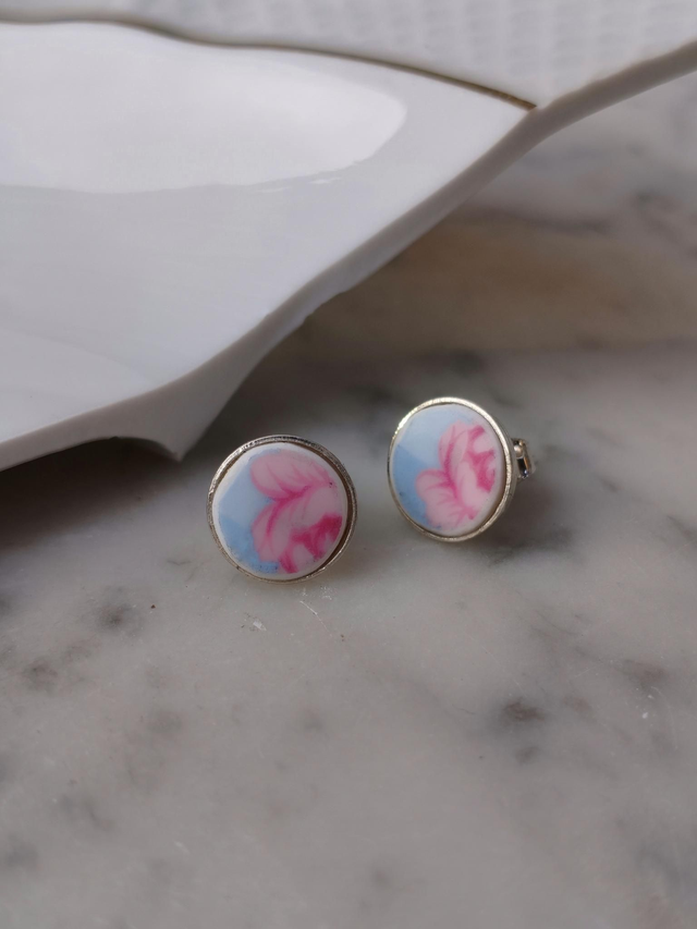 Ces boucles d’oreilles sont façonnées à partir d’un fragment de tasse en porcelaine, dont l’origine exacte reste inconnue. Le motif vichy bleu clair est ponctué de délicates roses, apportant une note romantique tout en restant sobre. Les éléments ronds d’environ 10 mm offrent un équilibre parfait entre motif et forme. Une paire pleine de charme, qui prouve que l’anonymat d’une porcelaine n’enlève rien à sa beauté.