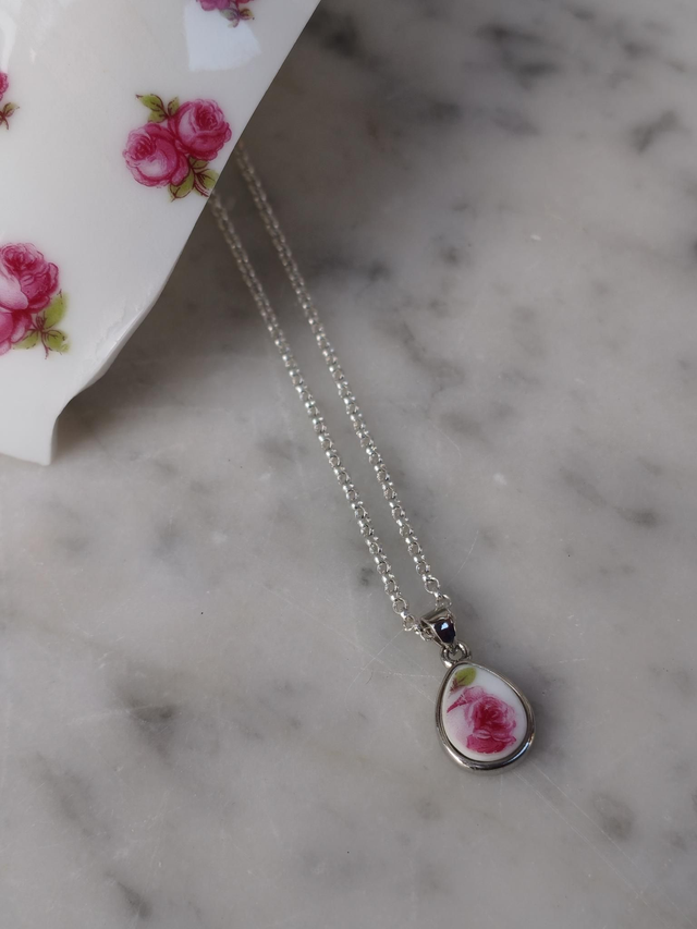 Ce collier est façonné à partir de porcelaine de la manufacture Pirkenhammer, produite entre 1918 et 1938. Le pendentif en forme de goutte met en valeur un décor de roses délicates sur porcelaine blanche. La goutte mesure environ 10 mm et est montée sur une chaîne d’environ 50 cm. Un bijou discret et romantique, qui traverse les époques avec élégance.